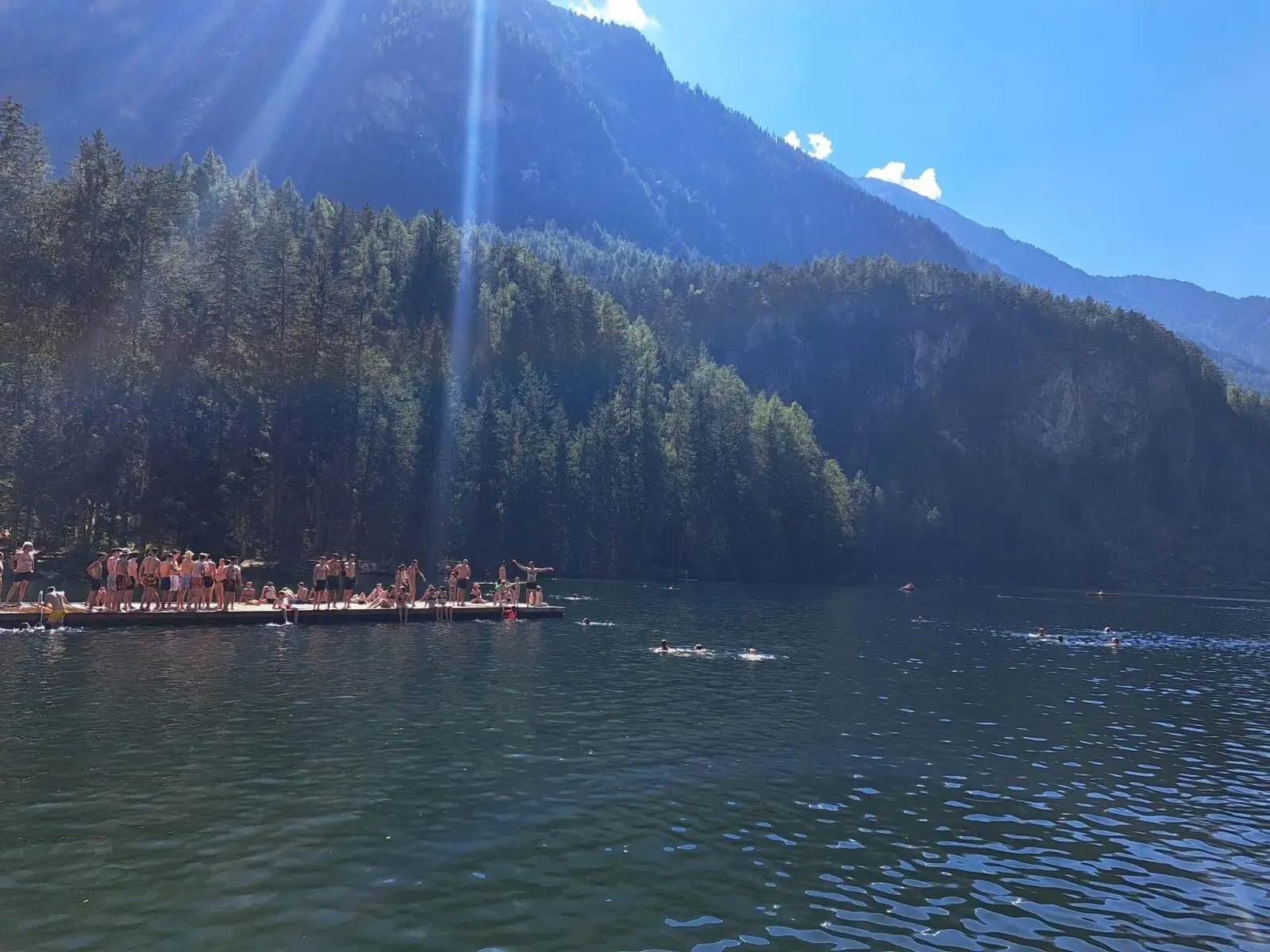 משם אפשר לשחות לרפסודה במרכז האגם. ולהשכיר קייאק. המים קרירים אבל נעימים אחרי מספר שניות של הסתגלות.
